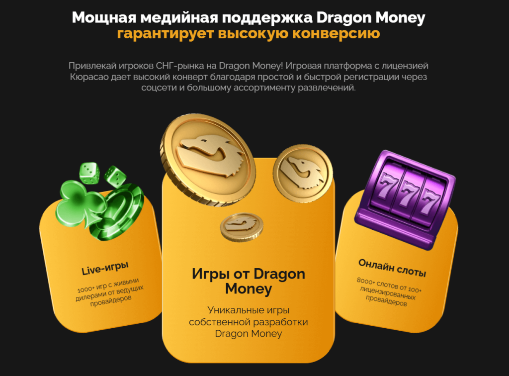 Dragon Partners предлагает одни из самых конкурентных условий на рынке гемблинга, ориентируясь на взаимовыгодное сотрудничество.